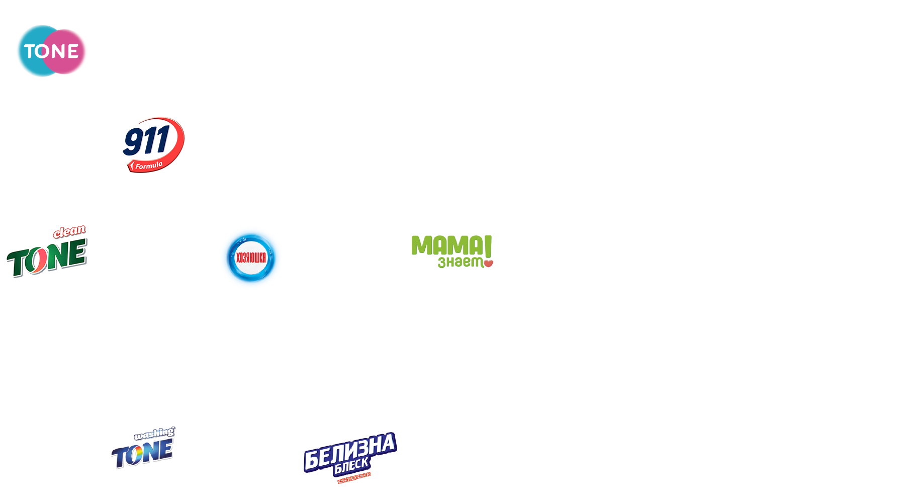 For more than 20 years of development, the assortment has expanded to 5 trademarks: Clean TONE, Washing TONE, Khozyayushka, 911, Belizna-Blesk, which have rightfully received a positive assessment from millions of customers and won their loyalty.
